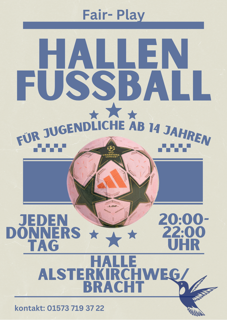 Jeden Donnerstag von 20:00 bis 22:00 Uhr bietet das Kolibri jungen Leuten ab 14 Jahren die Möglichkeit, in der Turnhalle am Alster Kirchweg in Bracht Fußball zu spielen. Eine Voranmeldung ist nicht erforderlich. Bringt bitte unbedingt Hallenschuhe mit!