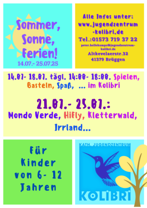 In der ersten Ferienwoche, also vom 14.07. bis zum 18.07.25 findet das Ferienprogramm täglich von 14:00 bis 18:00 im bzw. am Kolibri statt. In dieser Woche werden wir wieder kreativ sein, Spiele spielen und eine Menge Spaß haben. Die Teilnahmegebühr für diese Woche beträgt 40,-€. Im Preis inbegriffen ist täglich ein kleiner Snack. Diese werden wir voraussichtlich täglich mit einer kleinen Gruppe von Kindern in der Küche gemeinsam zubereiten.